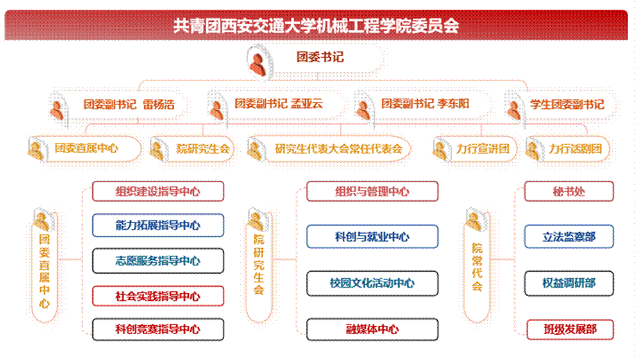 院团委设置团委书记1名、副书记3名、学生副书记5名。院团委下设5个直属中心,负责yl6809永利官网团组织的思想引领、组织建设、科创实践与考核评优等工作,为学院基层团组织提供指导和服务。同时指导学院研究生会、研究生代表大会常任代表会和力行宣讲团开展工作。各直属中心主要职能如下: