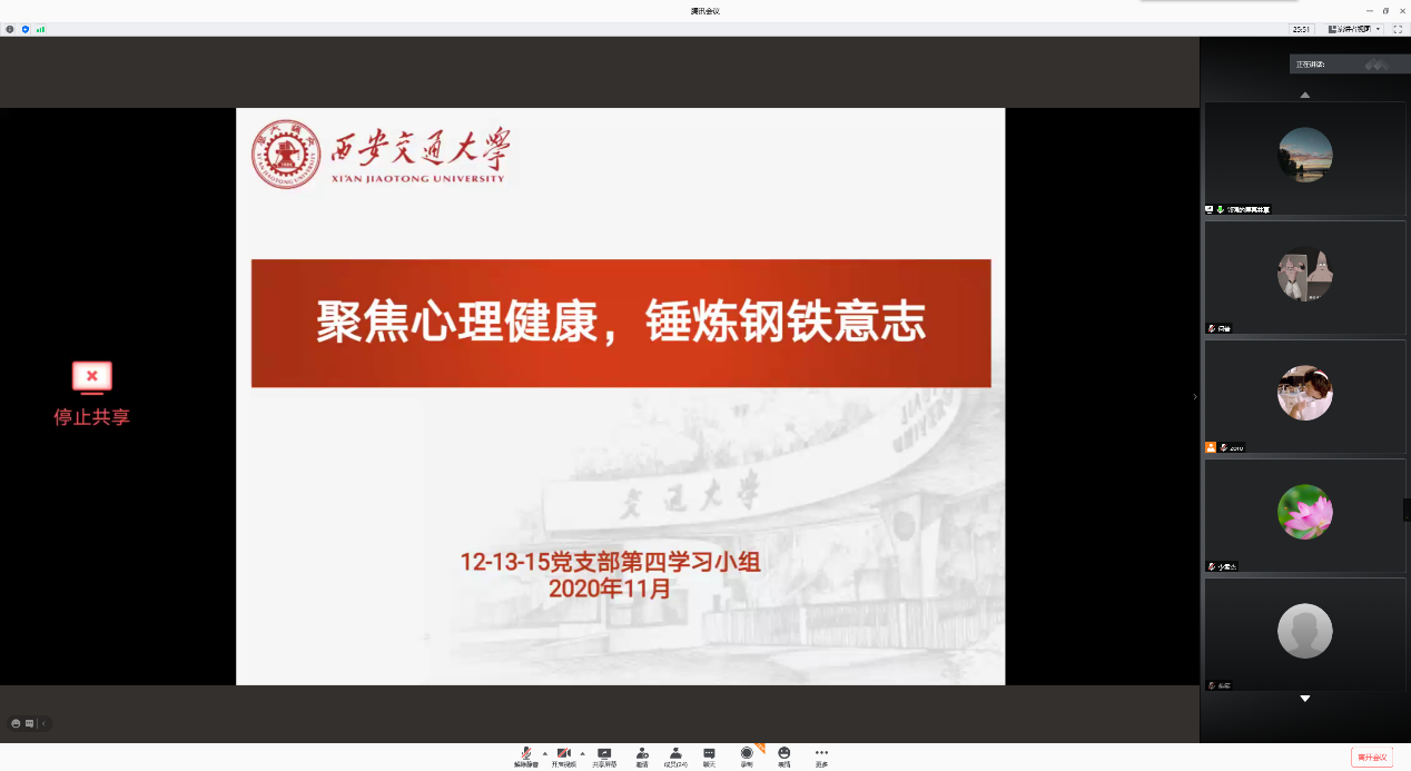 学业压力、就业压力、师生关系、情感关系……心理压力与人际关系是我们生活避不开的两个话题,远有武汉理工大学陶同学难忍恶劣的师生关系,酿成惨剧,近有大连理工大学化工学院研究生留遗书自缢。种种惨剧历历在目,同时研究生的心理健康与人际关系问题愈显突出。2020年11月30日晚7时20分,yl6809永利官网硕9012-13-15党支部于线上腾讯会议平台,就研究生的心理健康与人际关系问题为主题,开展了组织生活会。本次生活会由支部书记陈航航主持,就日常研究生较敏感的学业就业压力、师生关系、情感问题等话题展开探讨与分析。