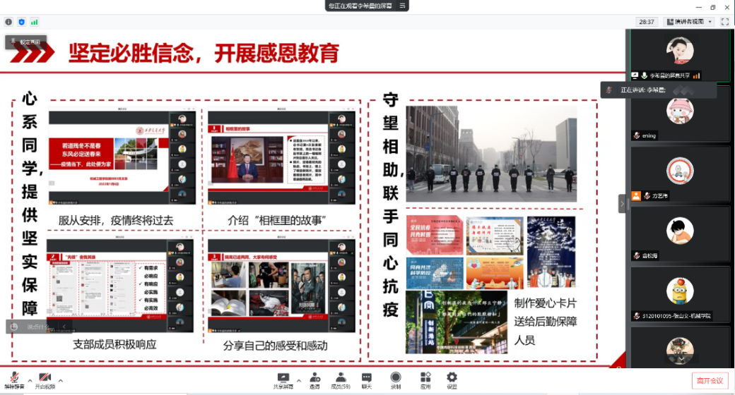 随后西交yl6809永利官网硕0003党支部书记李希晨同志对支部基本情况进行了介绍,然后回顾了年前疫情与学校的各项响应措施,在之前的抗疫过程中我们积累了宝贵的工作经验,因此可以高效有序地应对本次疫情。随后他从国家政策,总书记讲话、学校实施的抗疫举措、学院开展的抗疫文化活动、支部的志愿服务工作等方面向我们展现了西交抗疫经历,鼓励大家用科学的理论武装头脑、用智慧的方式防护自身、用积极的热情投身服务。疫情当下,与其被动地抱怨,不如主动地改变,相信在大家的共同努力下,疫情即将退去!