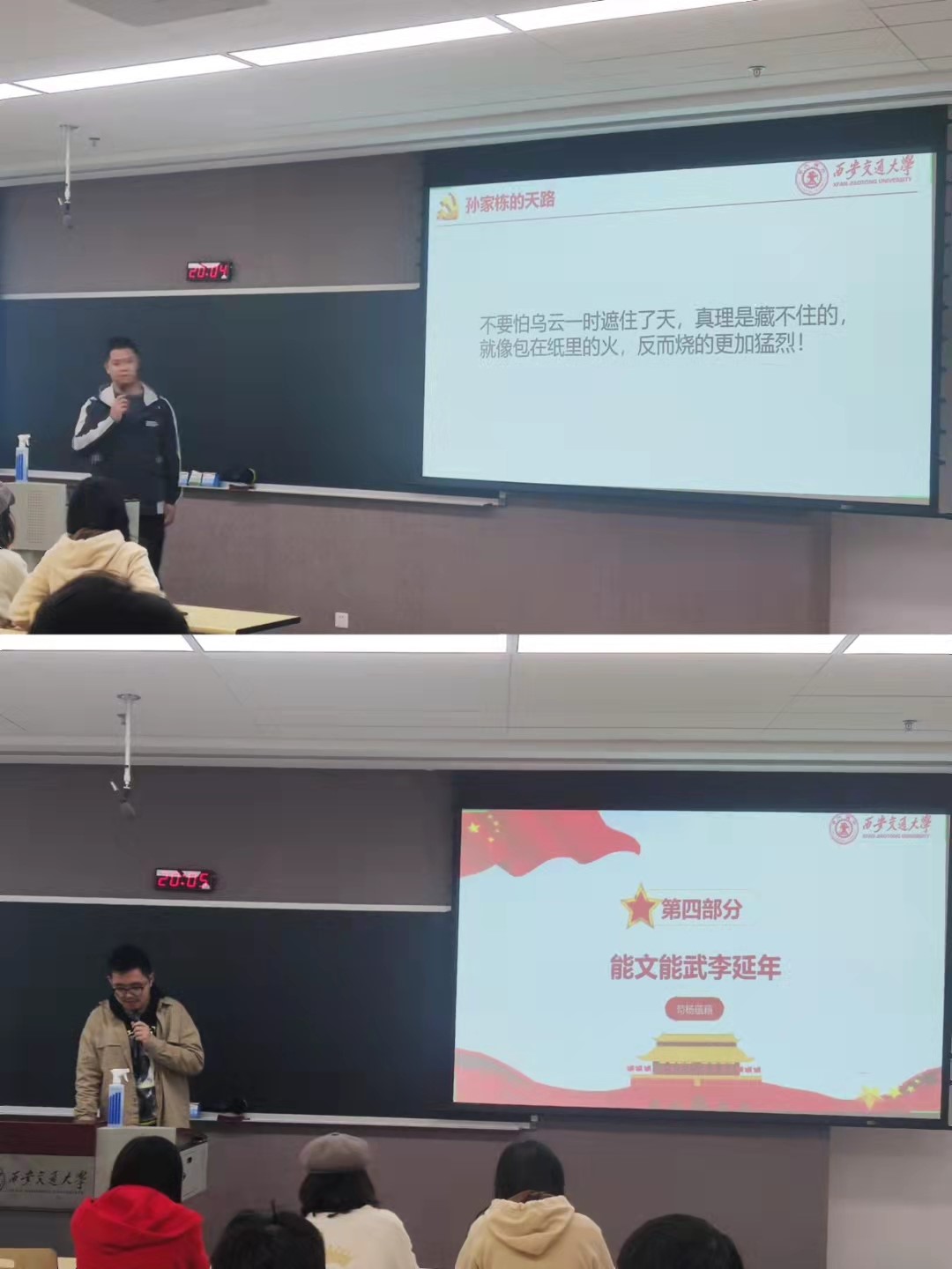 王昊同学通过播放孙家栋同志的功勋事迹视频和生动形象的描述,让大家了解到一个勤奋、有胆识、爱国的功勋,并引用了一句话作结语:不要怕乌云一时遮住了天,真理是藏不住的,就像包在纸里的火,反而烧的更加猛烈!不由得让我们对孙家栋同志产生由衷的敬佩之情。芶杨蕴藉同学从笃定信念跟党走、战火硝烟写忠诚、永葆本色当好兵三个方面介绍了始终保持党员和军人革命本色、居功不自傲、自身要求严的老英雄李延年,阐述了自己对功勋描绘的老英雄的敬佩之情,还表达了自己对《功勋》和《长津湖》两部文艺作品的看法和思考。