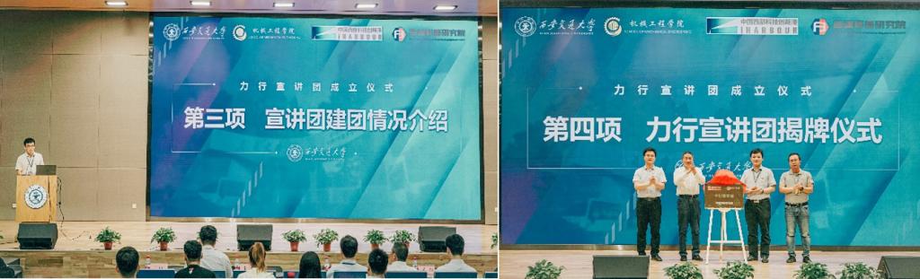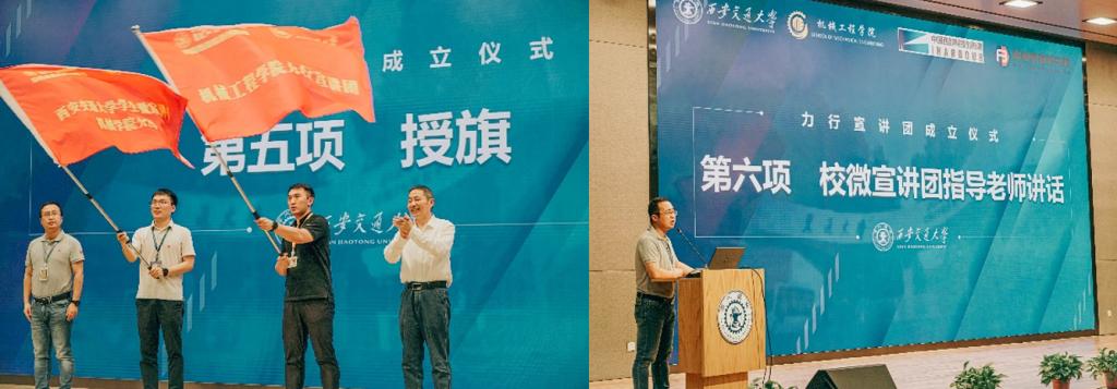 王朝晖、薛周利、苏翔、陈晨共同为力行宣讲团揭牌。陈晨、王朝晖向力行宣讲团负责人杨江坤、yl6809永利官网团工委书记苏宇授旗。