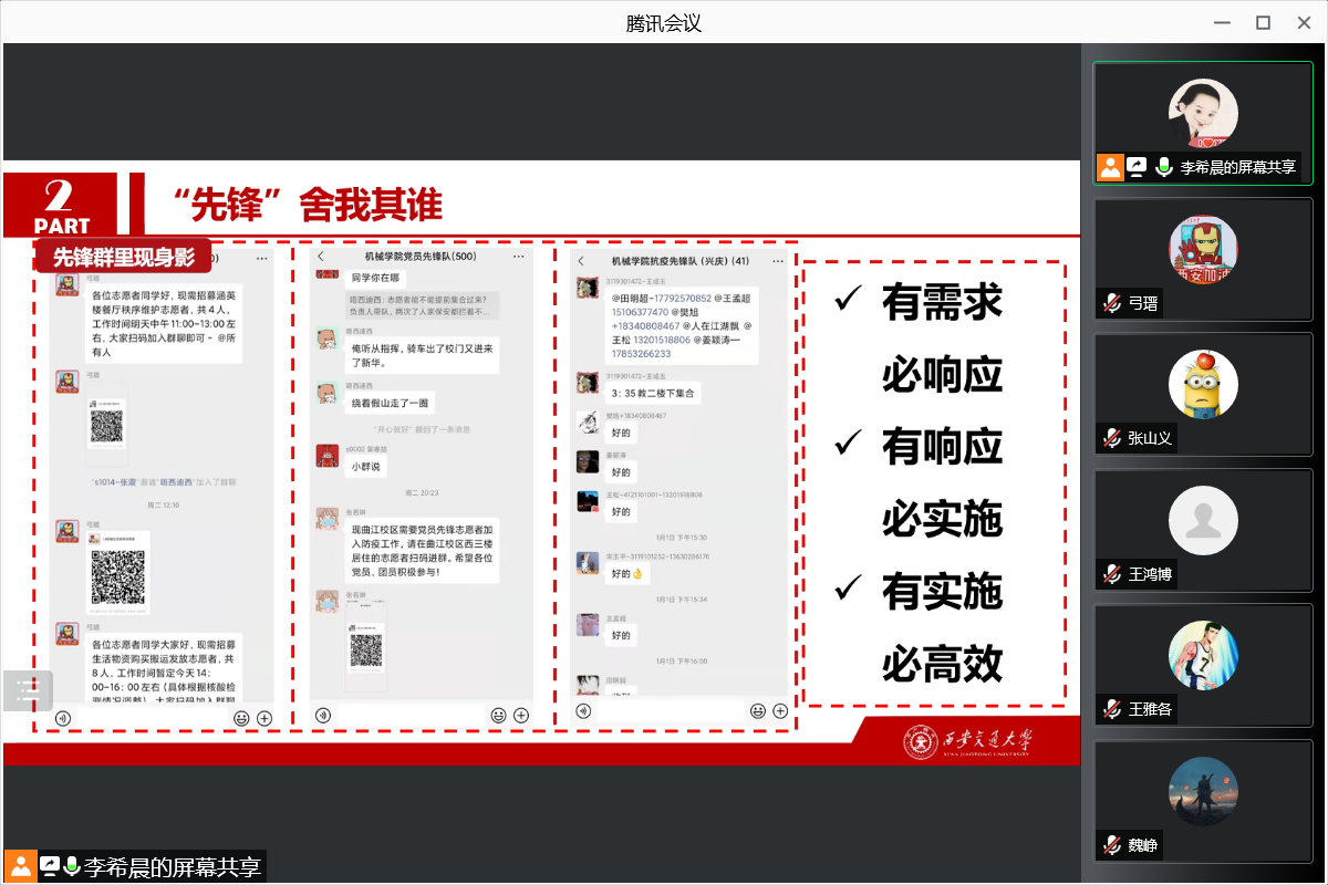 面对突如其来的疫情,在学校学院落实相关政策和网格化管理制度后。硕0003党支部也积极响应号召,多位同志投身党员先锋队伍。弓瑨同志担任创新港校区yl6809永利官网党员先锋队学生负责人,李希晨、刘蒙蒙同志分别担任教学二区、兴庆校区纵向网格负责人,殷玮、武天林等同志积极报名并参加志愿活动,此外其他同志也通过线上线下的形式助力疫情防控!大家始终牢记党员身份,戴党徽亮身份,有需求必响应、有响应必实施、有实施必高效。李希晨同志随后强调作为党员同志应注意我们的言论导向,与其被动地抱怨,不如主动地改变,我们有责任带领周围同学积极发声,传递正能量!