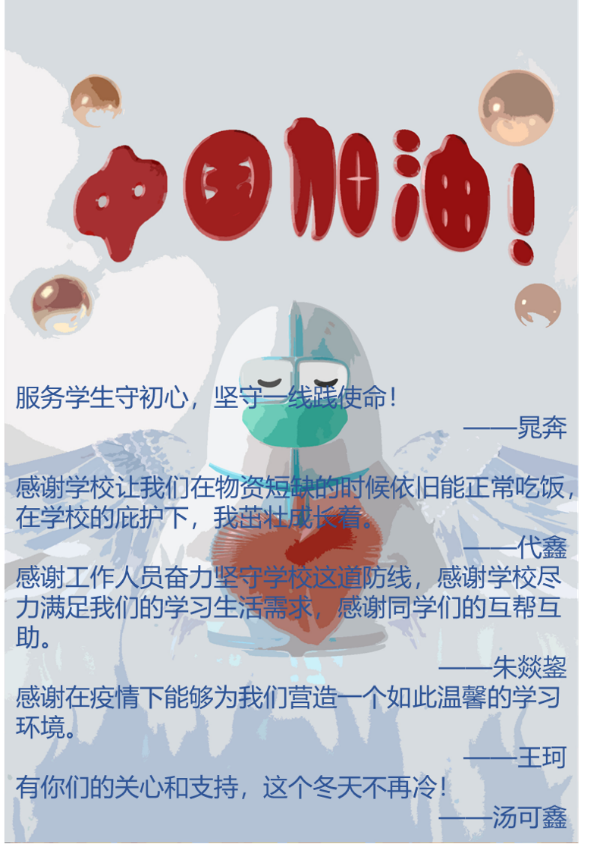 齐晨云同志表示:“疫情给同学们的生活、学习带来很大的不便,我参加了测温、发放物资、核酸秩序的志愿活动,想尽自己的一份力去帮助同学解决困难。不管是在招募志愿者时,还是服务过程中,我都能够体会到大家的积极与热心,这是一种向上、团结的力量。没有一个冬天不会过去,没有一个春天不会到来我们戮力同心,终将战胜疫情。”