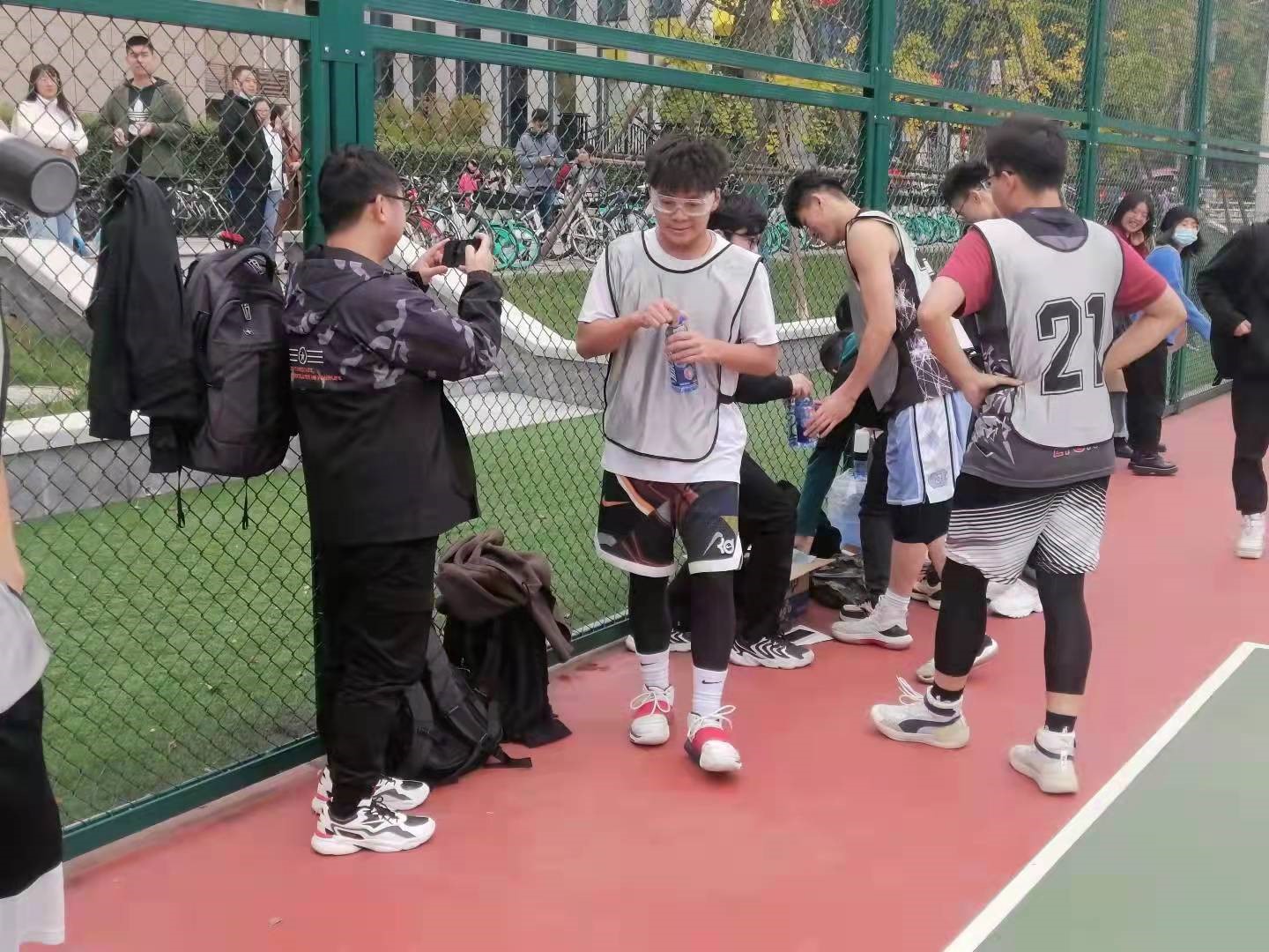 同时S1004班同学积极响应“办实事真干见真效,为师生真情暖人心”团日活动。他们派出一批志愿服务人员在默默的为比赛的顺利开展保驾护航,他们分别是贾赛普、邱华光、汤可鑫、王冰璘、焦耿豪、张宁宇、王轲和上官子彬,他们会在休息期间为赛场所有球员和观赛人员提供水和饮料,保证球员们能够以最优的姿态出现在赛场,同时在比赛后他们也会维持现场卫生,确保来时干净,走时干净。