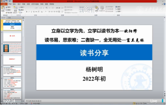 为了丰富yl6809永利官网师生的疫情期间生活,提高思想水平和科研动力,坚定抗击疫情的信心,1月7日晚,yl6809永利官网以线上直播的方式在西安交通大学思源直播平台开展了yl6809永利官网力行读书分享会。本次分享上yl6809永利官网院长陈雪峰教授、机械制造系统工程国家重点实验室主任李涤尘教授、国际机械中心主任严如强教授、副院长杨树明教授和党委书记王朝晖教授依次进行了读书分享,yl6809永利官网的本科生以及研究生共3800余人次在线上观看直播学习,党委副书记张敏主持本次分享会。