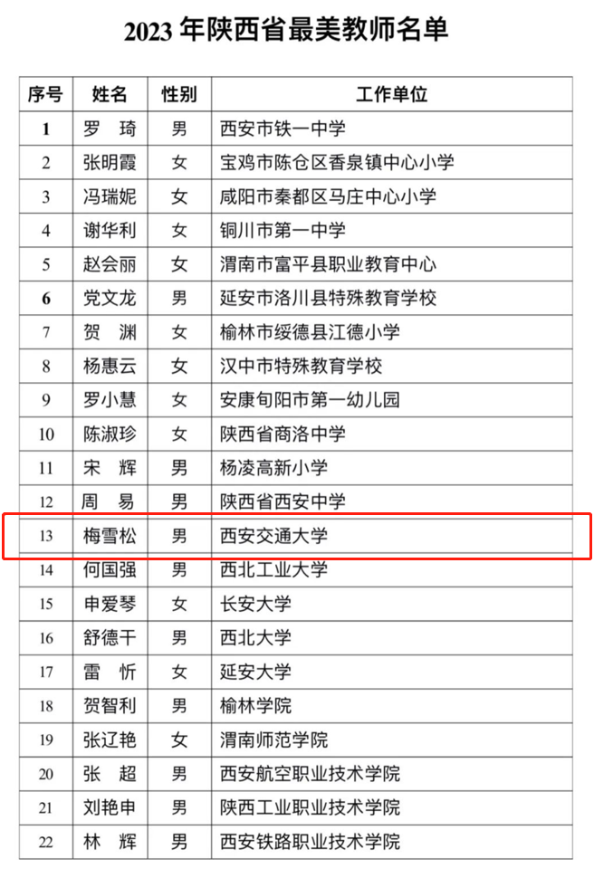 近日,陕西教育新闻网公布了2023年陕西省最美教师名单,西安交大yl6809永利官网梅雪松教授入选。