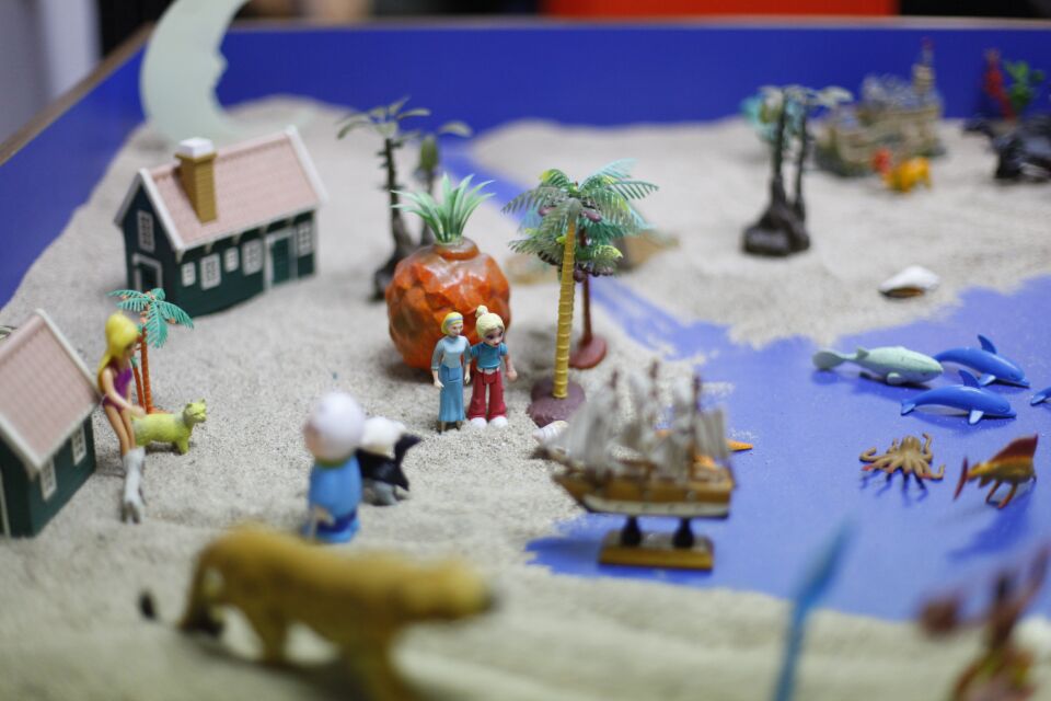 沙盘游戏其实很简单,沙盘上的沙子代表陆地,当沙子被聚拢在一起,沙盘上就会空出一片蓝色,那便是大海,湖泊的象征。游戏时,参与者可以在道具区凭感觉随意取来自己中意的道具放在沙盘上合适的位置即可。