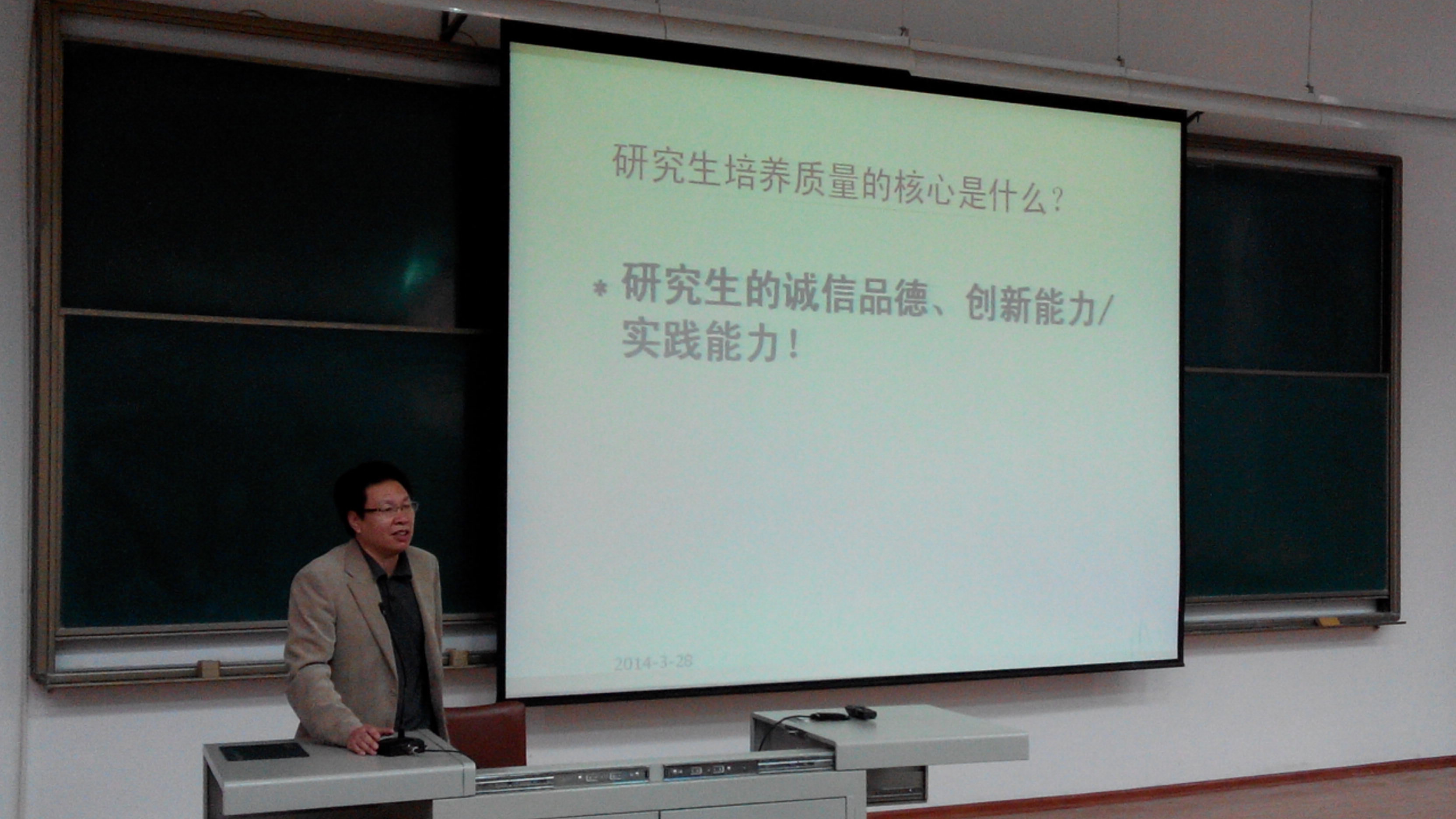 李秀兵副院长在报告会上向同学们解释了人才、教育的实质,回答了研究生培养的核心问题。并在幽默有趣的讲解中,提醒了广大研究生在学术道路上容易犯的错误,包括客观条件限制导致的错误、个人疏忽导致的错误以及学术不断行为。接下来,李院长着重讲解了学术不端行为。他通过对国家学术评定政策的详细介绍,使研究生们了解到了必不可少的法律知识。为了使大家能更好的做好学术,李院长同时向我们讲到了和导师细微关系的处理方法。最后,李院长通过实际案例,称学术造假是自己为自己安装的“定时炸弹”,提醒大家要深刻意识到诚信做学术的重要性。