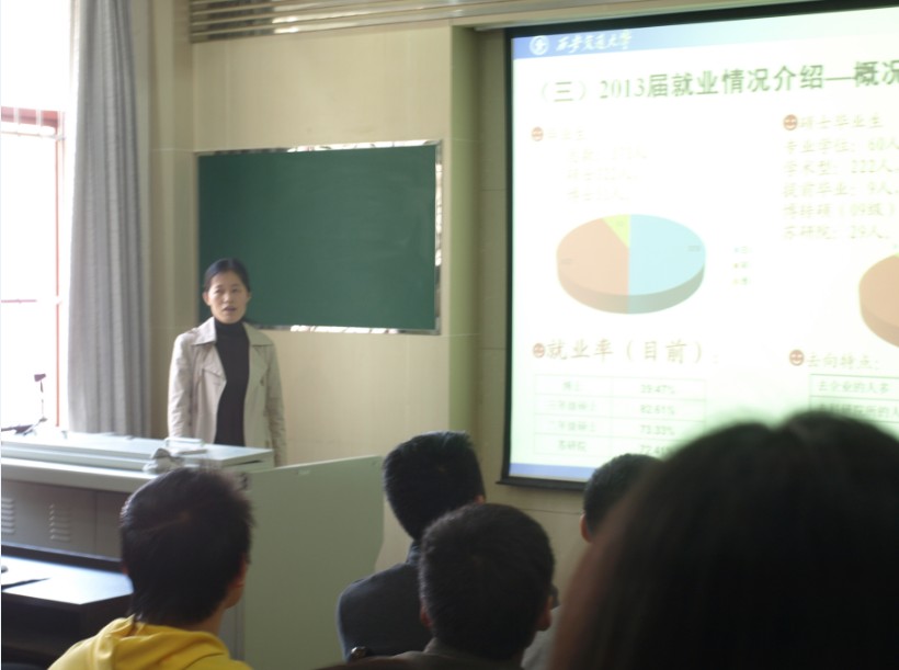首先,雷老师对2012届和2013届毕业研究生的就业情况图表并茂,分门别类的进行了详细介绍。根据最新统计数据,在370名2013届毕业研究生(硕、博)中,硕士签约率达到80%以上。与去年相比,今年的就业去向特点仍然是:去企业的人最多(超过5成),其次是去科研院所(超过3成)。近年来,在就业形势日趋严峻的情况下,yl6809永利官网研究生的就业质量稳中有升,就业前景持续乐观。