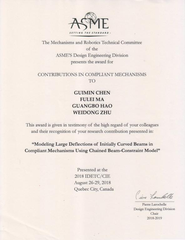 在加拿大Quebec举办的2018 ASME International Design Engineering Technical Conferences & Computers and Information in Engineering Conference上,yl6809永利官网机器人与智能系统研究所陈贵敏教授等的论文“Modeling Large Deflections of Initially Curved Beams in Compliant Mechanisms Using Chained Beam-Constraint-Model”获得美国机械工程师学会机构学与机器人技术委员会的Compliant Mechanisms Award(柔顺机构学奖,奖金1000美元)。本篇论文是2018年ASME柔顺机构奖项的唯一获奖论文。