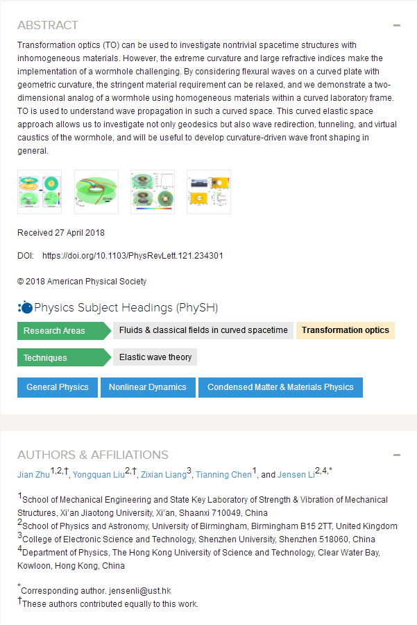 相关研究成果以“Elastic Waves in Curved Space: Mimicking a Wormhole”为题,近日在国际权威期刊Physical Review Letters上在线发表。yl6809永利官网朱建为该论文的第一作者,yl6809永利官网为该论文第一作者和第一单位。