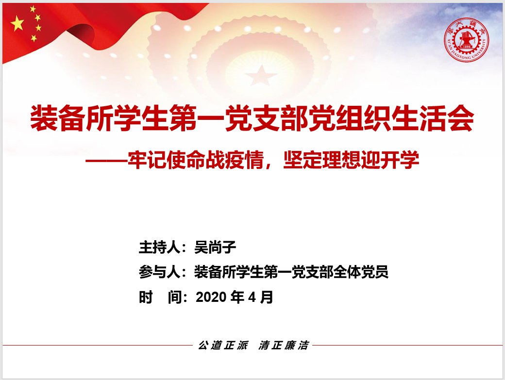 牢记初心使命,坚定理想信念。2020年4月21日,西安交通大学yl6809永利官网装备所博士生第一党支部开展了主题为“牢记使命战疫情,坚定理想迎开学”的线上党组织生活会,会议由党支部书记吴尚子主持。