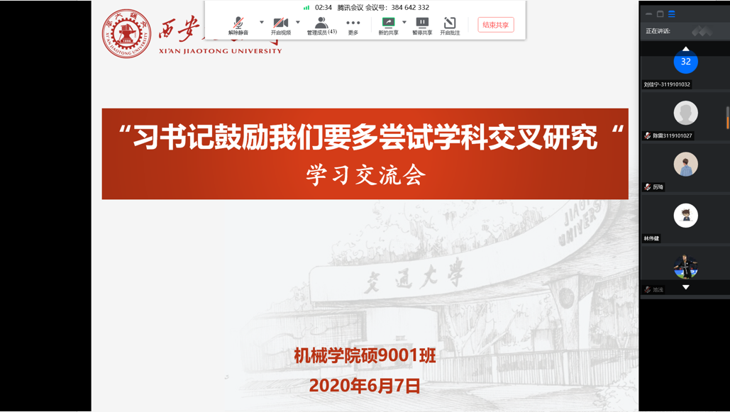 2020年6月7日星期日晚上7:30分,yl6809永利官网硕9001班团支部在腾讯会议中开展了持续两个小时的“习近平总书记鼓励我们要多尝试学科交叉研究”线上学习讨论交流会,团支部书记张骞主持了这次会议,会上同学们讨论积极。